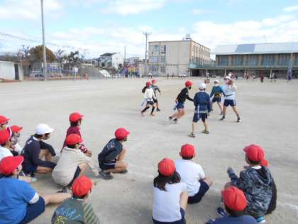 今日は,タグの取り方や逃げ方を考えるために,タグ取り鬼ごっこを行いました。2チームに分かれて,タグを取り合います。逃げる方向や追い掛け方を工夫しながら,元気いっぱい活動していました。