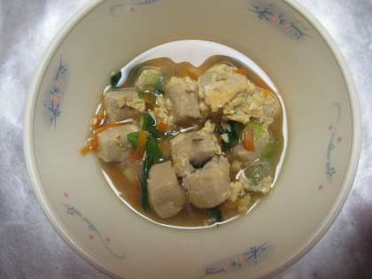 「高野豆腐のたまごとじ」は,高野豆腐をけずりぶしのだしで,さとう・しょうゆで煮含め,野菜を軟らかく煮た中に高野豆腐を加え,卵でとじています。今日は「ねぎ」も入りとても彩よく出来上がっていました。