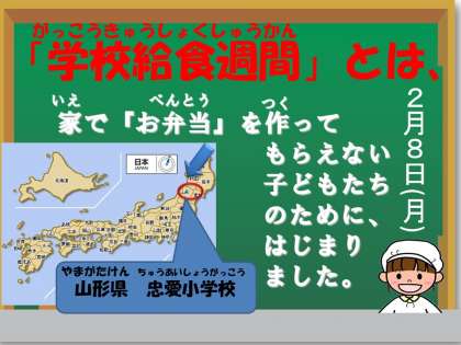 今日から給食週間が始まりました。「給食の歴史」や給食委員会からの給食クイズを給食時間に全校に配信しています。この機会に,給食についてたくさん学習してほしいと思います。