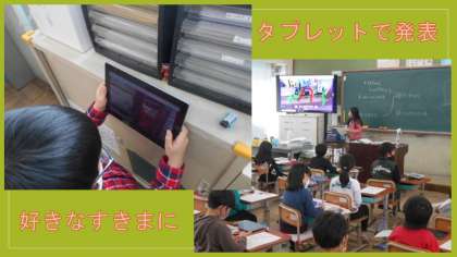 プリント入れやロッカーの間など,好きな隙間に「すきまちゃん」を置いたら,タブレット端末で撮影します。様々な「すきまちゃん」の写真をまとめて先生のタブレット端末に提出したり,友達が撮った写真を鑑賞したりしました。子どもたちが頭の中で自分の世界をつくりあげ,ストーリーを考えながら,「すきまちゃん」を撮影していました。