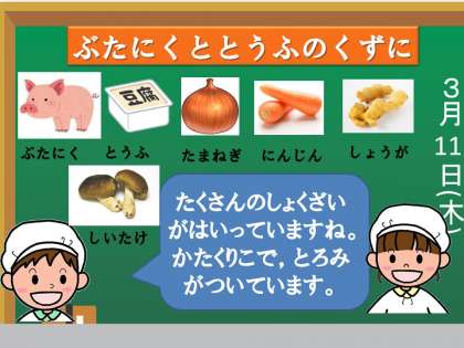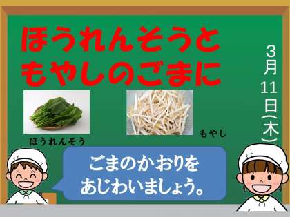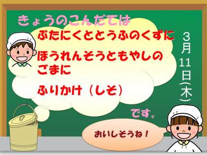 今日の給食は「麦ごはん・牛乳・豚肉と豆腐のくず煮・ほうれん草ともやしのごま煮・ふりかけ(しそ)」でした。