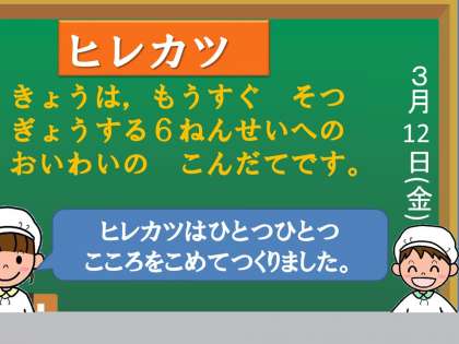 子どもたちは,手作りの「ヒレカツ」を喜んで食べていました。「ソースも給食室で,手作りしたよ。」と話すと,「どうして作るの」と興味深く聞いてくれる児童もいました。