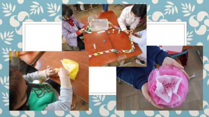 お花紙を丁寧に折り,上手に広げて,たくさんのお花をつくりました。また,様々な色の折り紙を組み合わせ,班のみんなでつなげて,とても長い輪飾りを作ったり,チューリップの葉や花を折ったりしました。