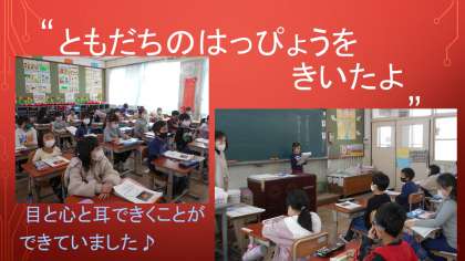 この学習では,友達や先生,おうちの方に「できるようになったことを伝えたい。」という気持ちをもって進め,自分の成長もしっかりと実感することができていました。また,読み手や聞き手に分かりやすいように,順序立てて書いたり,題名を工夫したりできていました。その姿を見て,こんなに成長したんだなと後ろで,涙がこぼれそうになりました。子どもたちにたくさんの拍手を送りました。聞き手の子どもたちも「すごい!」と言いながら,続けて拍手をしてくれていました。おうちでも,子どもの作品に目を通し,表現の上手さを褒めたり,成長したところを認めたりしてあげてください。