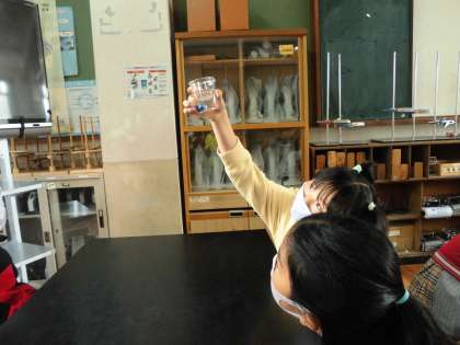 水の中にあるビー玉の数は……?正解を当てようと必死にビーカーの中を覗き込む子どもたちです。いろいろな角度から物事を見ること,実験に使う器具は丁寧に取り扱い,安全に注意することなど,たくさんの気付きがあった1時間でした。