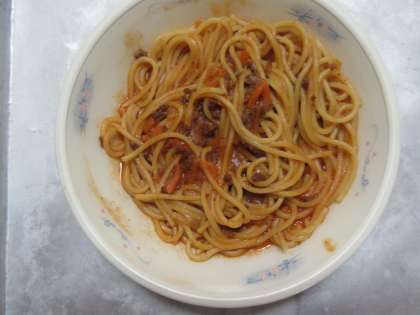 今日の給食は,1年生の入学を祝う行事献立で,「小型コッペパン・牛乳・スパゲティのミートソース煮・ほうれん草のソテーでした。