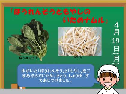 「ほうれん草ともやしのいためナムル」は,野菜に苦手な子どもにも人気のメニューです。よく食べてくれているので,とても嬉しいです。