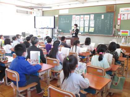 『うたに あわせて あいうえお』の詩を,姿勢や口の形に気を付け,はっきり読むことを練習しました。黒板に視線を集中させ,懸命に読む姿が印象的でした。