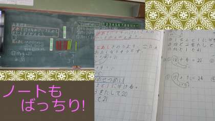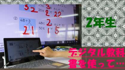 2年生の教室に入ると算数の学習をしていました。教室では,算数科のデジタル教科書を使って大きなテレビ画面に映し出しています。数のまとまりに着目して,繰り上がって何十何になる暗算の仕方を学んでいました。ノートに学習のあしあとを記すのも速くなってきた2年生です。