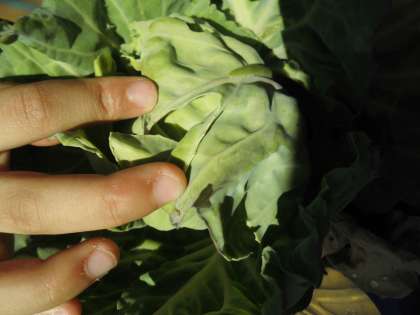 前回,捕まえたモンシロチョウの幼虫がゴールデンウィークが明けて一回り大きくなりました。子どもたちのキャベツ畑にもたくさんいます。今日は幼虫の観察をしました。キャベツの中にいる黄緑色の幼虫を探すのは一苦労です。子どもたちは,観察カードを書くことにも慣れてきて,色,形,大きさをしっかり確かめてカードに残すことができています。それ以外にも,「うにょうにょした動きをしていたよ。」,「よく見ると透明の毛が生えていたよ。」,「キャベツを食べていたよ。」など,幼虫の様子が丁寧に観察できていました。