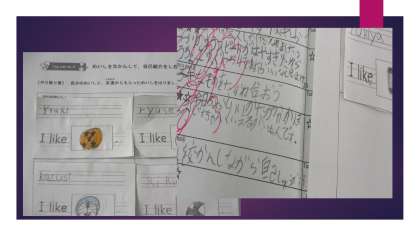 名刺には,自分の名前と自分の好きなものの絵をかいています。何人かの友だちと自己紹介をしました。相手の目を見て,にっこり笑顔で話していました。コロナ禍で,マスクをしていますので,表情が分かりにくいのですが,にこにこしているのはよく分かりました。友だちのことを知るのって楽しいですよね。集まった名刺を貼り,ワークシートを眺めながら,子どもたちは,喜んでいました。