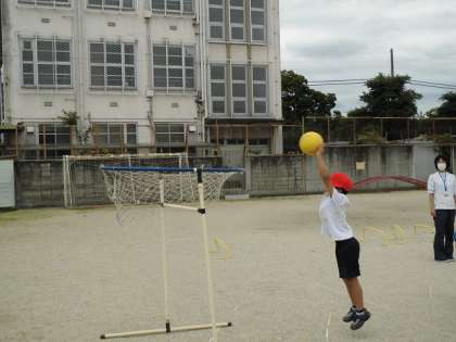 足をしっかり上げてミニハードルを越えたり,リズムよくジャンプしたりする運動と,ゴールを見て高くボールを投げる運動をしました。