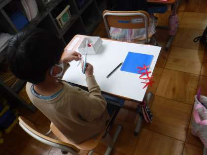図画工作科では,折り紙を折り,ハサミでチョキチョキ切って飾りを作りました。三角に折ってきれいな模様ができたり,四角に折って人が手をつないでいる形に切ったりしました。できたものは画用紙に,工夫しながら貼りました。