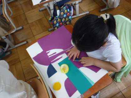 まずは,まっすぐや斜め,ジグザグに画用紙を破りました。破いた画用紙を組み合わせたり,重ねたりして動物や,乗り物などを表しました。子どもたちは,破いた画用紙をじっくり見て,「犬が座っているみたい。」,「新幹線の形みたい。」とたくさん想像しながら活動を楽しんでいました。