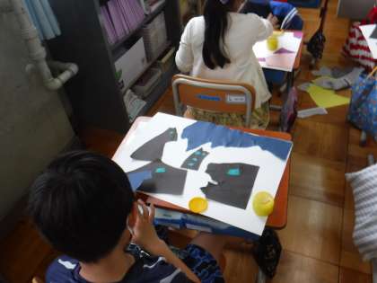 図画工作科では,破いた画用紙の形から想像して絵にする活動をしました。