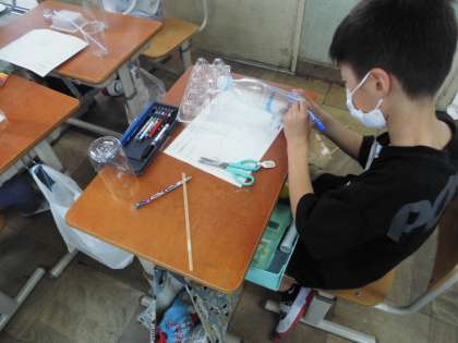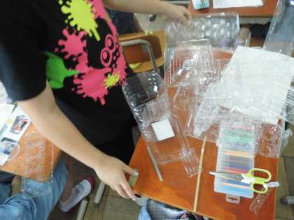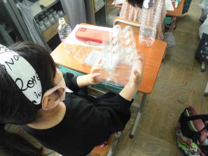 図画工作でプラスチックの容器から動物を作る「クリスタルアニマル」を作成し始めました。今日は,お家で集めたプラスチック容器を切ったり,重ねて置いたりして作りたい動物を考えました。
