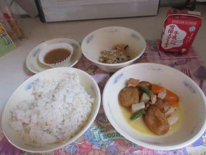 今日の給食は,「麦ごはん・牛乳・平天とこんにゃくの煮つけ・切り干し大根の三杯酢・ういろう」でした。