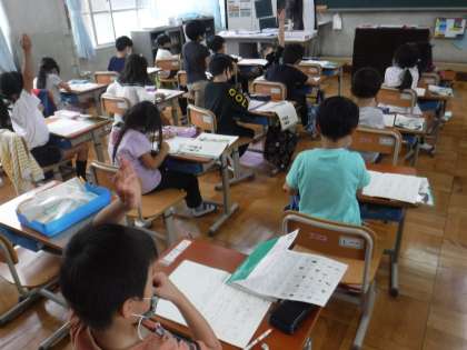 国語科や,算数科の学習では,黒板を見ながらノートに板書を写すことをしています。めあてもしっかり書いて,字も丁寧に書けています。すばらしい!