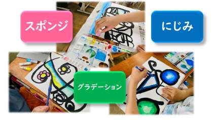 今日はそれぞれが,にじみやグラデーション,またスポンジや指で表現するなど様々な色の表し方を見ることができました。
