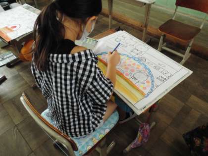 図画工作の『言葉から形・色』の題材では,物語を読んで心に残った場面を絵に表しています。「やさしい感じにしたいところはコンテで表そう。」「笑顔でうれしい気持ちを表すために,オレンジ色にしようかな。」と,自分の思いを表すために様々な工夫をし,意欲的に活動しています。