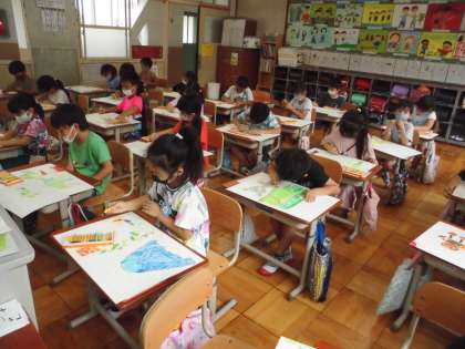 お話を聞いて,好きな場面を絵に表す学習をしています。自分の思いに合った色を使って,楽しく描くことができています。素敵な作品になりそうです!