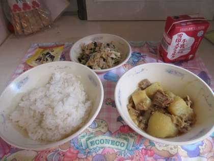 今日の給食は,「ごはん(酒米)・牛乳・肉じゃが(カレー味)・切り干し大根の煮つけ・黒大豆」でした。