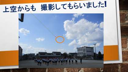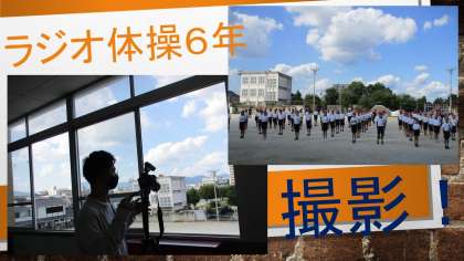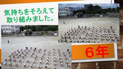 青空の下,6年生は,気持ちをひとつに指先までそろえて,ラジオ体操を披露しました。運動場,3階の廊下,上空からも撮影をしてくれていました。