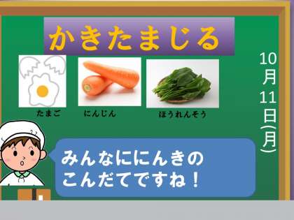 「かきたま汁」は,鶏卵・にんじん・ほうれん草が入って彩もよく,子どもたちに人気の献立です。今日も美味しく頂きました。