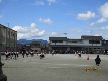 2年生の団体競技「台風の目」です。どのようにコーンを回れば,速く走ることができるかペアで考えながら練習してきました。今日の本番は,次の人に棒をつなぐため,ペアで協力しながら,一生懸命走っていました。