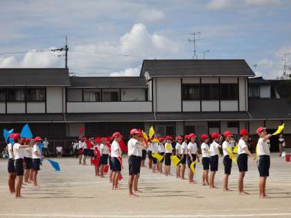 今日の最後の種目は,6年生の団体演技でした。自分自身の体で表現したり,旗を使って表現したり,様々な工夫が見られました。緊急事態宣言下で,学年全体の練習期間が短くなってしまいました。しかし,本番は学年全員で気持ちを合わせて,すばらしい演技を見せてくれました。