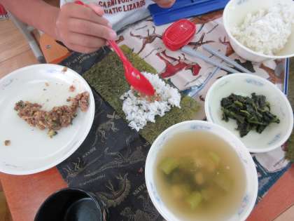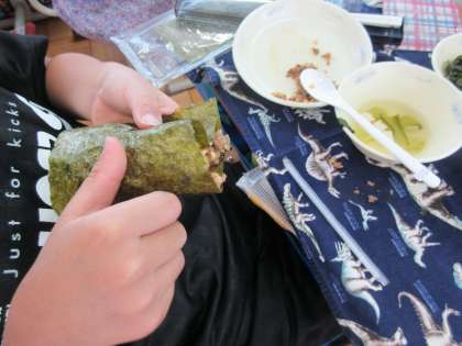 「肉みそ納豆」は,手巻きのりにご飯をのせ,肉みそ納豆を芯にしてのりで巻いて食べます。じょうずにまいて食べられましたね。