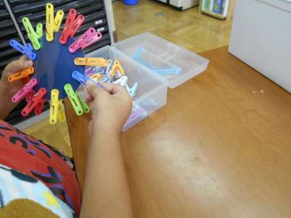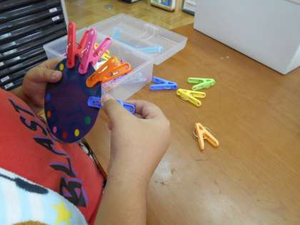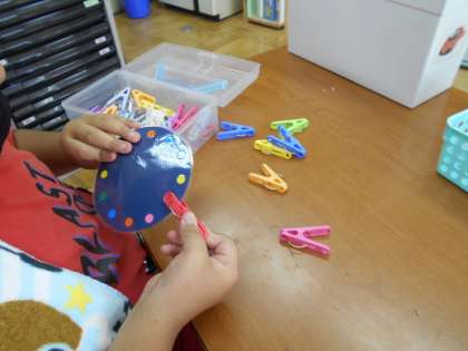 鉛筆が上手に持てない,筆圧が薄い児童は,洗濯ばさみを使った指先トレーニングをしています。色のポイントに同じ色の洗濯ばさみを付けていきます。
