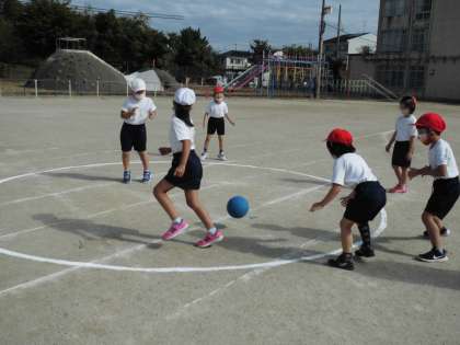 1年生は,「ころがしドッジボール」の学習に入りました。初めてのボールを使ったゲームです。ルールを守りながらチームの友達と作戦をたてながら仲良く進めていきます。転がし方を工夫したり,すばやくにげるようにしたりと元気よく動き回って楽しむことができました。