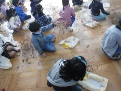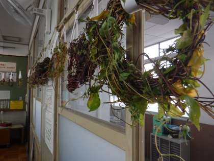 1年生は,5月から育ててきたあさがおのツルを使って,リース作りをしました。ツルを支柱から外したり,丸く巻いていくのに苦戦していましたが,みんな上手に作ることができました。飾りつけをするのが楽しみです。