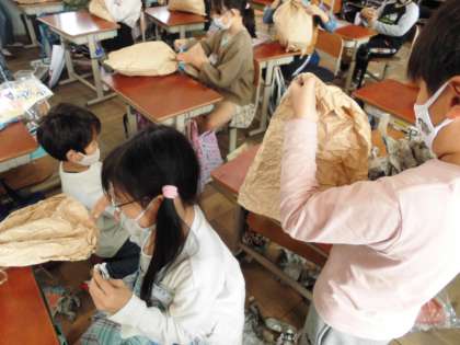 くしゃくしゃにしたりぎゅっとしたりした紙に新聞紙を丸めて入れて,色々な場所を紐やリボンでしばって「何に見えるかな?」と想像を広げました。「お化け」「魚」「熊」色々なものに見えてきたようです。