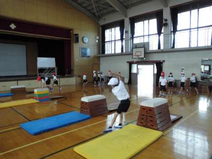 「跳び上がり・跳び下り」「またぎ乗り・下り」「開脚飛び」「前まわり跳び」様々な跳び方や段数に挑戦しています。
