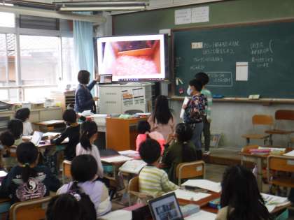 各班で見つけてきたものや,聞いてきたことなどをタブレット端末を上手に使って発表し,気になったことは質問し合いました。ほかの班の発表を聞きながら驚いていました。