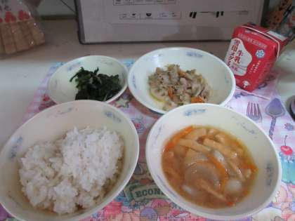 今日に給食は,「麦ごはん・牛乳・豚肉とれんこんの煮つけ・ほうれん草の煮びたし・いものこ汁」でした。