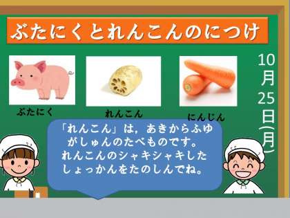 子どもたちに,「今日は,どの献立が美味しかった?」と尋ねると,「豚肉とれんこんの煮つけが,れんこんがシャキシャキして美味しい」とか「ほうれんそうの煮びたしが,えのきがツルンと美味しい」と言ってくれました。よく味わって食べていることが,うれしかったです。