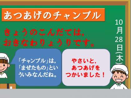 「チャンプル」は,「混ぜ合わせたもの」という意味で,給食では,厚揚げとやさいを炒めて卵でとじました。
