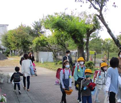 感染症対策を講じた上で,保護者の方には運動場で,待っていただきました。放送の指示通り,南校舎3階から保護者の方に迎えにきていただきました。