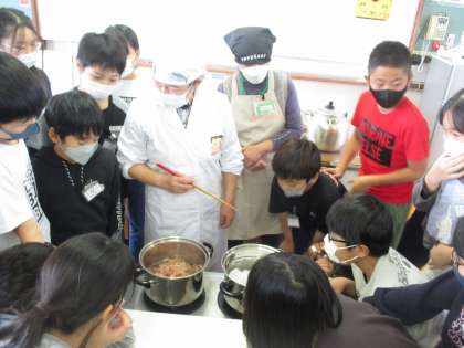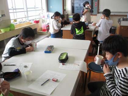 本日5年生は,家庭科で「だしに学ぶ」の学習を行いました。鰹節の実物を見たり,鰹節ができるまでの様子を写真資料で確認したりの後は,いよいよ,だしの試飲の時間です。昆布だしの時は,「少しぬるっとしている。」という感想が,かつおだし・鯖節になると,「いい香り。」になり,合わせだしでは「おいしい。」そして最後の,吸い地になったときには,「最高。」の声が聞かれました。どんどん変化していく様子も合わせて,『和食』の素晴らしさを感じる学習となりました。