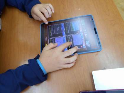 タブレットでプログラミングを使ってゲームを製作しています。完成したゲームを担任の先生にチャレンジしてもらいます。楽しんでもらえるように毎回コツコツとがんばっています。
