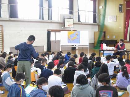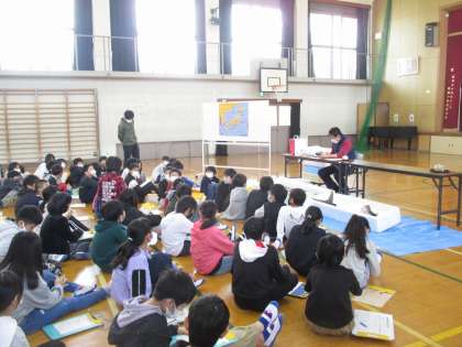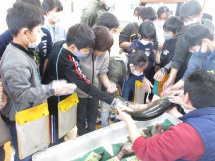 5年生では,総合的な学習で「お魚博士になろう」の単元で,ゲストティーチャーに来ていただき実際の魚を通して学びました。学習の中で,地球温暖化の影響で,獲れる魚が変わってきていること等,食の学習でもある一方,社会の情勢についても教えていただきました。お話を聞き,質問をし,最後はみんな興味津々で,持ってきていただいた魚に触れました。うろこの意外な硬さなどを体感できました。