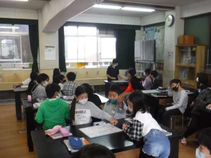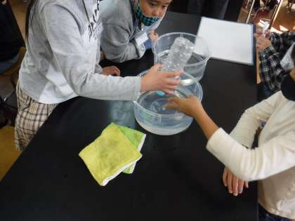 お湯に入れると膨らんで,氷水に入れるとへこんでいる様子に,とても驚いていました。その後,なぜそうなったのか次回にむけて少し予想をしました。