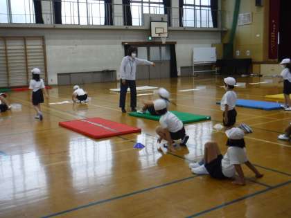 前転や後転につながる動きをしてから,前転や後転の練習をしています。足をそろえて回る,おしりをつかずに立つなどかっこよくできるよう懸命に練習していました。