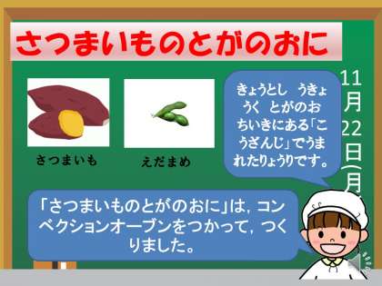「さつまいも」は,秋から冬にかけてが旬です。収穫してからしばらく保存しておくことで,甘くておいしくなります。「でんぷん」が多く,夏や力のもとになります。また,「ビタミンC」や「食物繊維」も多く含まれているので,お腹の調子をよくします。