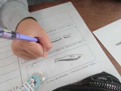 5年生の総合的な学習の時間の「魚っとおどろく魚博士になろう」が始まりました。先日は,「にぼし」を使って,「煮干しの解体」をし,魚の体のつくりを学習しました。