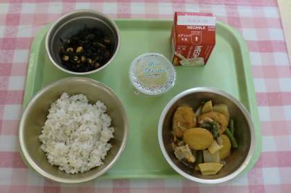 今日の献立は,「むぎごはん,牛乳,平天とこんにゃくの煮つけ,ひじき豆,リンゴゼリー」でした。