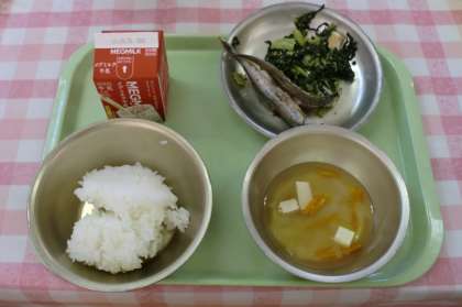 今日の献立は,「ごはん,牛乳,ししゃものからあげ,青菜の中華風いためもの,とうふのスープ」でした。